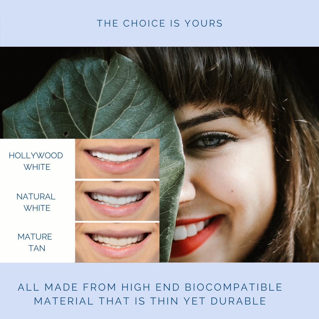 Obtenga más información sobre las distintas opciones de color blanco que tiene para su nueva sonrisa instantánea.