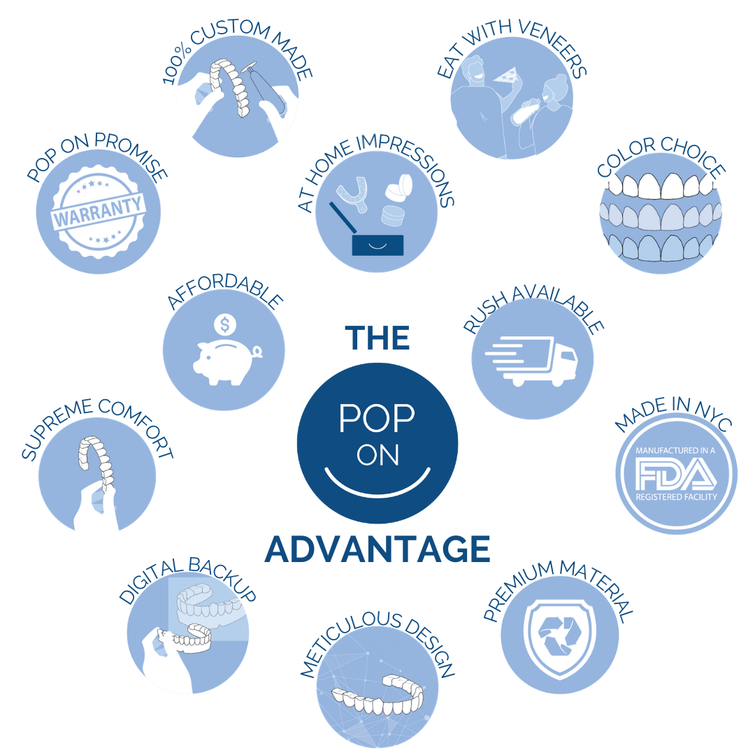 Al ofrecer el kit de impresión en casa directamente a los clientes, utilizando biocompatible de alta gama no tóxico, resistente a las manchas, material libre de BPA, y la mezcla de la tecnología de diseño digital de vanguardia con la mano de obra de técnicos maestros, Pop On Veneers ofrece una solución estética y una sonrisa de confianza que se personaliza para cubrir sus dientes y llevar todo el día.