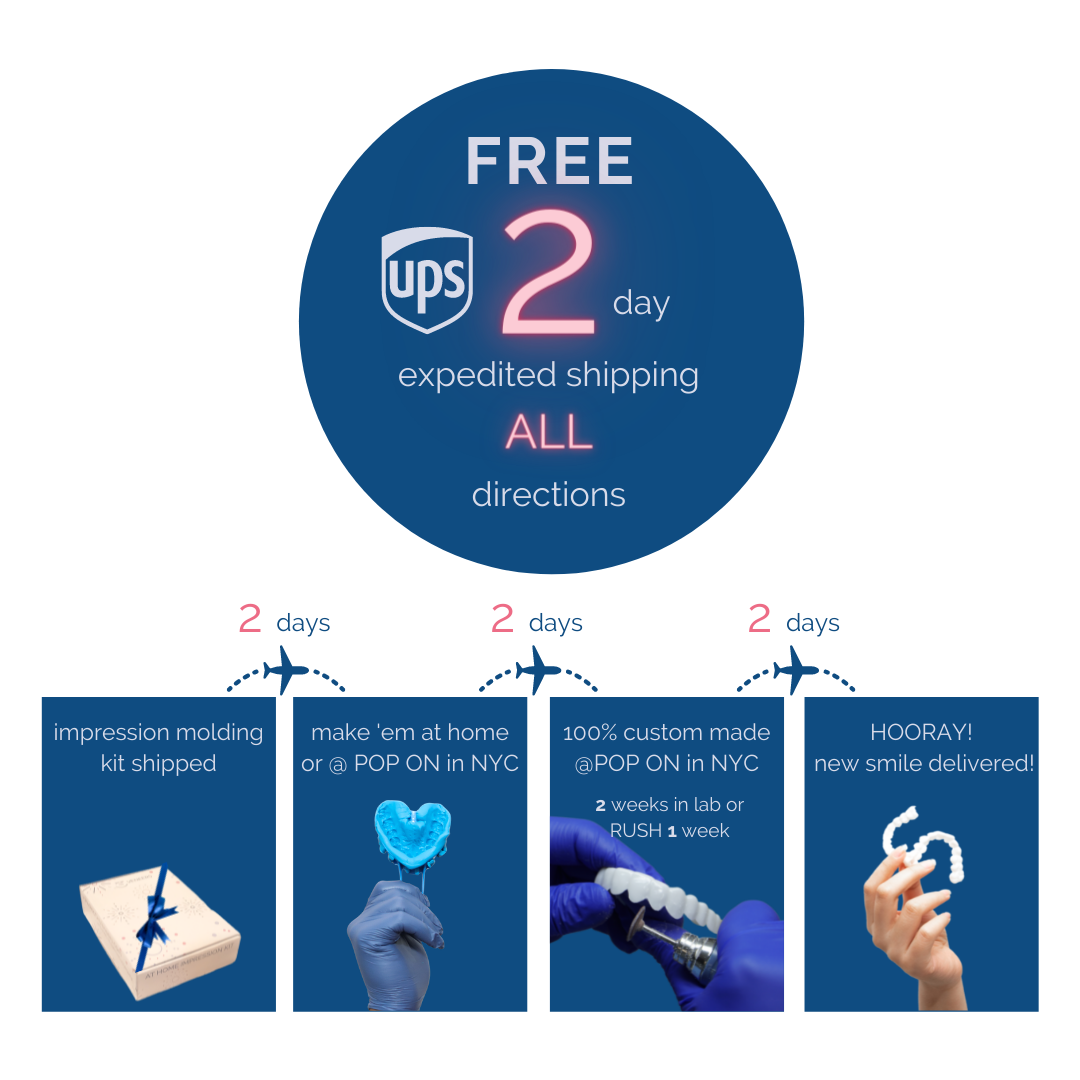 Le enviaremos sus carillas Pop On directamente a su casa en unas dos semanas y podrá empezar a celebrar su nueva sonrisa.
