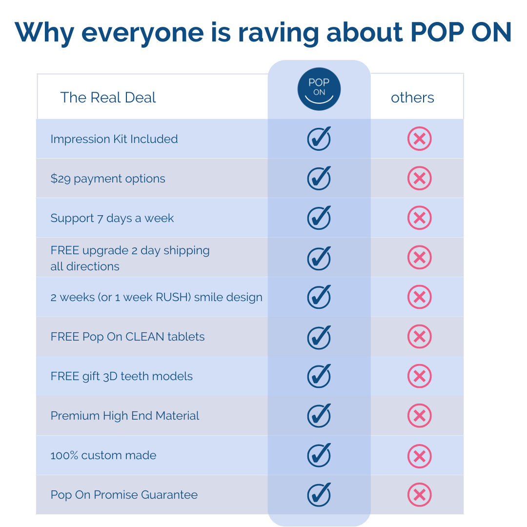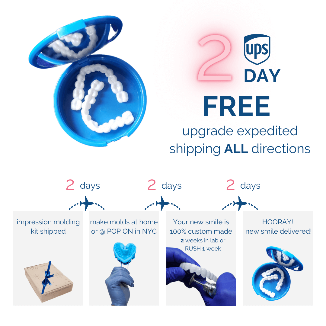 Nos comprometemos a ofrecerle una sonrisa que le encantará. Siempre incluimos una garantía de 30 días. En caso de que haya algún problema con el ajuste, reharemos su Pop On Smile hasta dos veces. Nuestro equipo está a su disposición en todo momento.